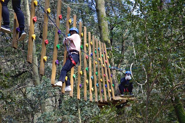 石燕湖丛林穿越分为三条路线,在树林间通过各种障碍项目组成了一条条挑战的线路,需要通过爬、滑、跨、跳、飞等动作通过障碍,最后到达终点。非常适合团队协作,一起感受丛林攀爬与林间穿越的刺激。