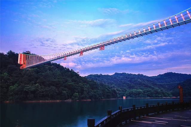 石燕湖高空玻璃桥桥长200米,宽2米,垂直高度达50米,可全方位观景,宛如“湖面之境”!青山、碧水与全透明天空廊桥相互映衬,人在桥上走,可清楚看到脚下的湖面风光,犹如高空行走,刺激无比。