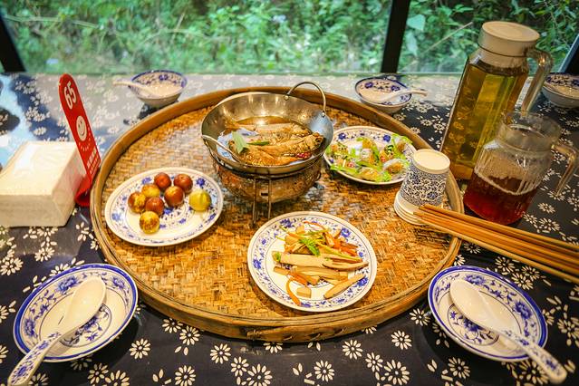 以前这种长桌宴是畲族用于接亲、嫁女之类的大型宴饮活动,如今已成为游客到访让川村必体验的项目。一碗碗、一盘盘的菜肴,通过长长的排列组合,四人一圆筐,吃饭的仪式感满满。