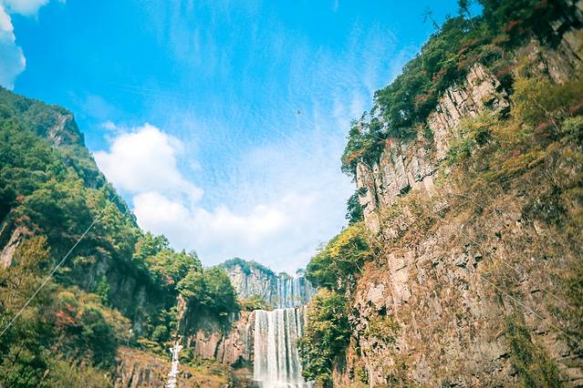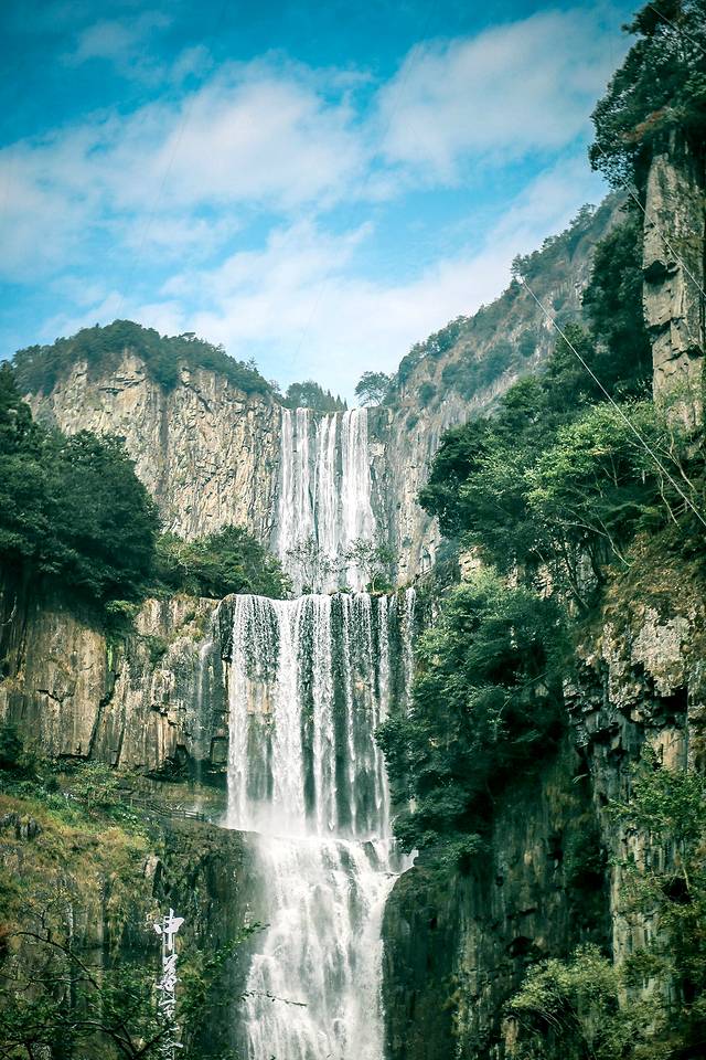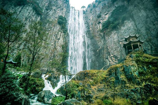 207米高的一漈飞流如云端袭来,素练悬空,状如银河垂地,水珠飞溅,咆哮如雷,如烟似雾。四周群山、峰林拔地而起,直插天际,有的如石塔、有的似展翅雄鹰、有的象水上风帆、有的象观音送子到天门。脚下松林参天、灌木密布。在曲径峻岭,小桥流水的衬托下,似一幅雄极壮丽的天工画图。