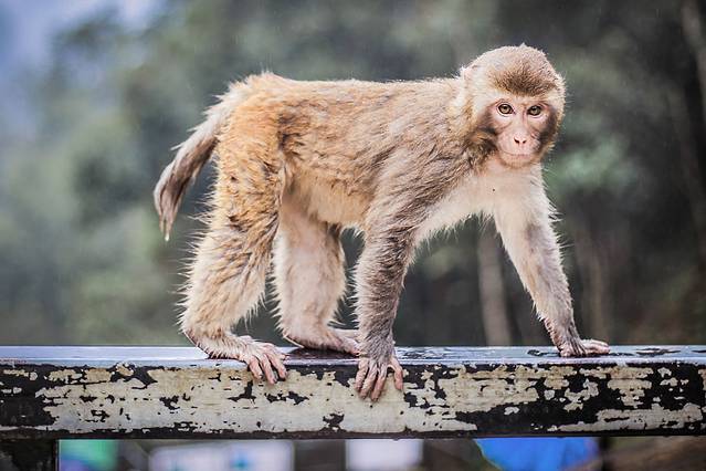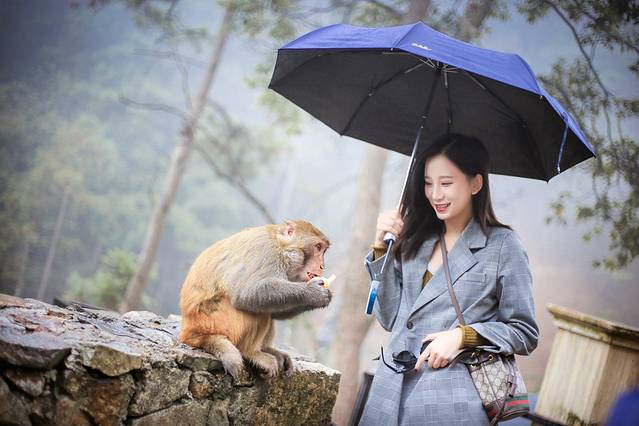 山中猴子常与山民争食,在林中奔跑跳跃时,森林翻滚起伏,犹如狂风刮过海面,绿波起伏。