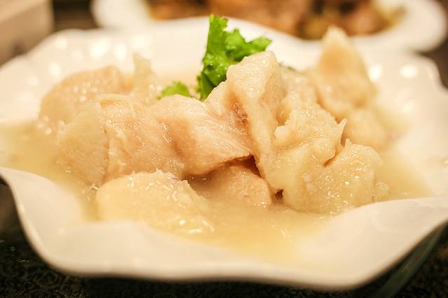 猪口赚拼翡翠豆腐:猪口赚即猪舌,文成方言“舌”近“蚀”,不吉利,民间将之改为“赚”。猪口赚经秘汤卤制,再现了文成乡村风味。悲翠豆腐由植物汁液酿制,色碧绿,有植物清香,入口柔滑。