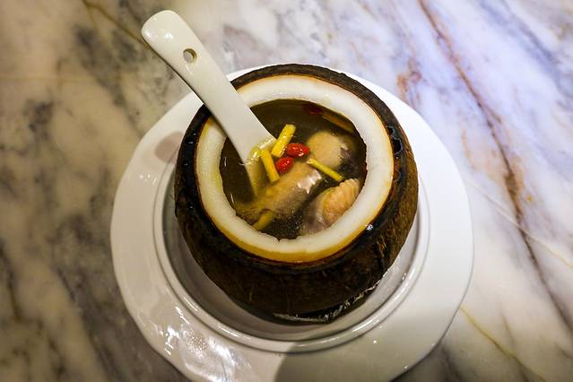 沿江椰子鸡盅:来自文昌椰林有淡淡的椰香的椰子与文昌放养鸡的鸡肉一起加入数位中药材,经过细火慢炖混合得恰到好处,一道海南的地道养生鲜美鸡盅就制好了,端上桌主要是椰子的椰香辅以淡淡的肉香!