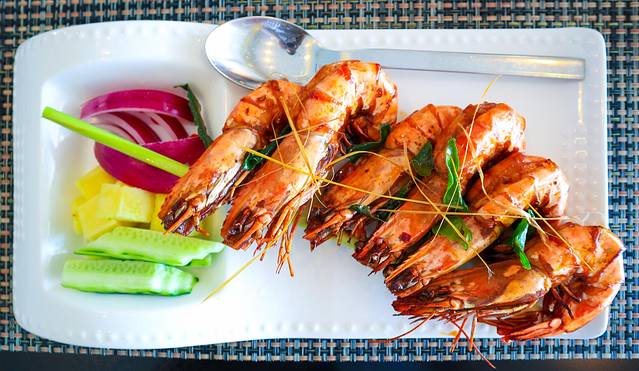 泰式烤大虾:去了虾线的大虾之后在泰式的汁水中很入味,配上黄瓜、菠萝、洋葱各种配菜,再配有泰式酱汁。