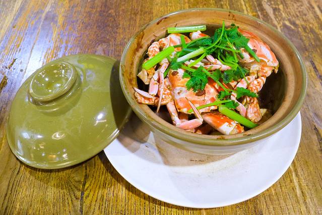 新鲜的蟹,店家将蟹不能吃的部分清理干净,我选用的是啫啫煲做法,这种做法能够锁住蟹的鲜味,同时能够让蟹更加入味,啫啫煲还能够很保温,所以不用担心点太多吃得慢而变凉。