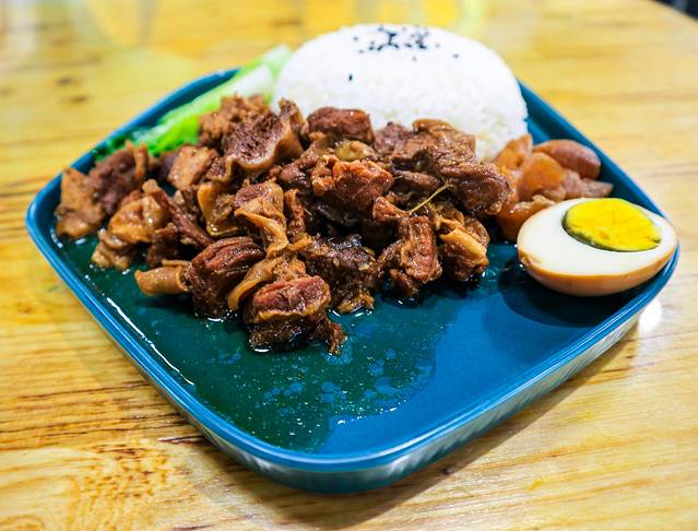 海南牛腩饭:选用牛腩部分,用高汤炖煮牛腩至肉松软,入口极化的感觉,还配有秘制泡菜,将泡菜、牛腩、米饭一起放入口腔中混合,又是一种不一样的味道!