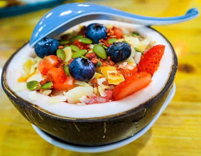 巴西莓椰子碗:巴西莓制成的甜品,有点像奶昔的感觉,酸酸甜甜的混合口感,吃着是一缕夏天来的感觉!