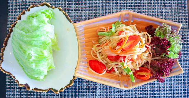 普吉岛木瓜沙拉,夹起木瓜丝放在生菜上一口放进嘴里木瓜和蔬菜的清新在嘴里散开;