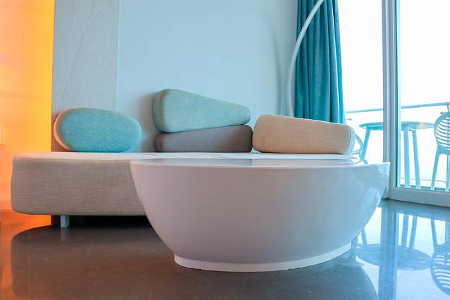 阳台上还有浴缸,可以享受海景沐浴。整个房间配置也是相当舒适与豪华,很有科技和设计感,一个水龙头都是4w,这也太奢华了。