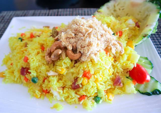 泰式海鲜菠萝炒饭里面混合着虾仁、鱿鱼块、腰果等都相当好吃!
