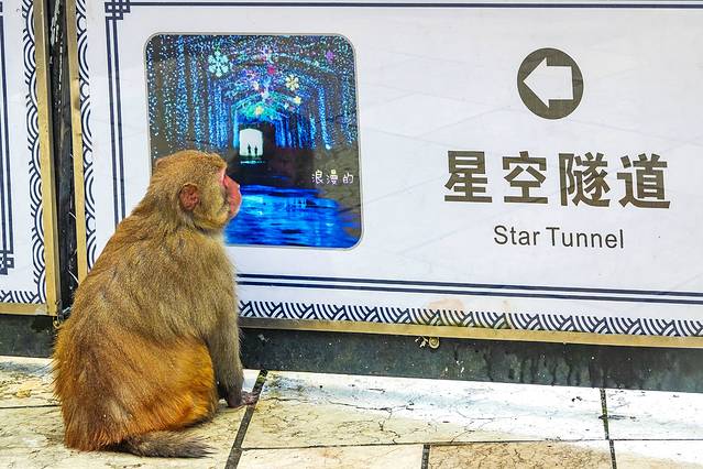 这只猴王不仅身体强健,感觉它的智慧也很超群,面对这个星空隧道宣传板,它足足端详了有一分钟的时间,难道它是想去星空隧道一游吗?还是想探索星空的奥秘,看来此猴王真的要成精了。