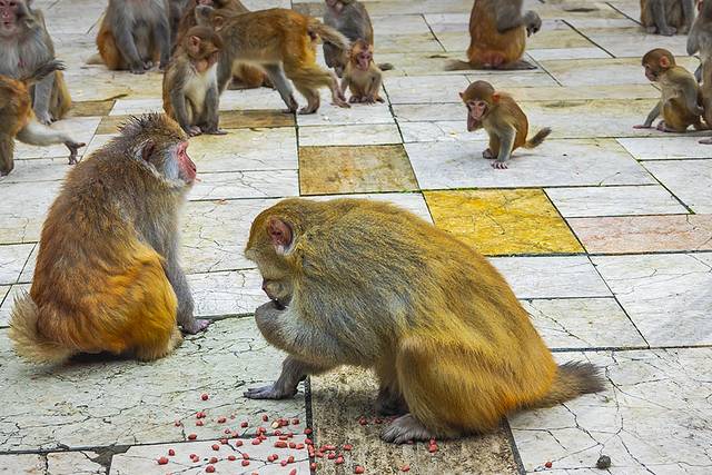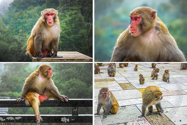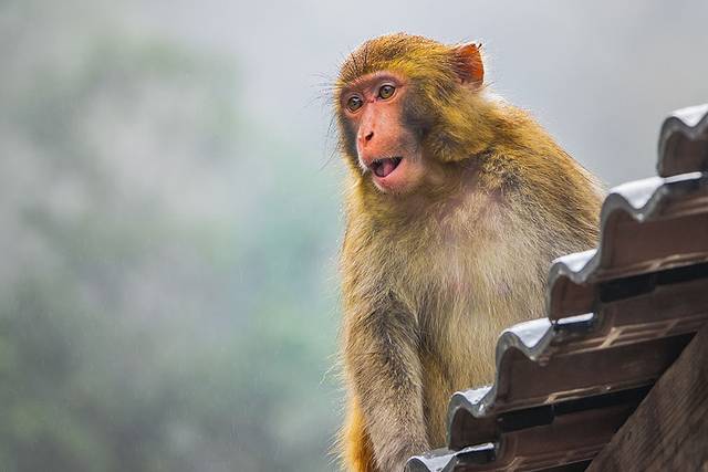 这只蹲在房檐上的公猴在眼巴巴的看着下面的群猴在分享美食就是不敢下来,我猜测它或许就是挑战的失败者,或者是被打败的昔日猴王。