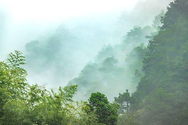 这是一条山谷,长十余公里,水帘洞是唯一与外界相连的通道。一场淅淅沥沥的秋雨让山谷仙气缭绕,仿佛真的进入到了电影电视中齐天大圣的仙境中。树冠摇曳中可见猴子们穿来穿去,就差一朵祥云的幻化就是腾云驾雾武功盖世的大英雄了!