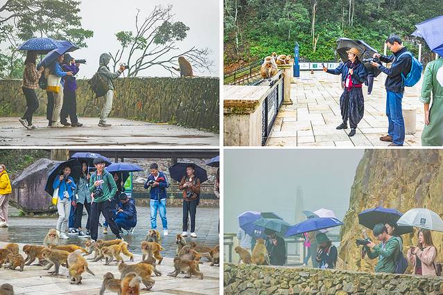 “三大纪律”:第一,一切行动要听从景区工作人员的指挥,步调一致才能玩的开心;第二,不许调戏猴子们,不能耍猴才能不被猴耍;第三,不能恐吓和打骂小猴子,更不能撸猴。“八项注意”:第一,喂食时最好放在地上,切莫让猴来手里抓;第二,尽量不穿红色的衣服或打红色的伞;第三,从包里取食物时切莫让猴子看到,否则很容易被抢包;第四,手中不要拿装其它物品的塑料袋,猴子会误认为是吃的;第五,猴子喜爱食用水果和瓜子花生,不要喂肉类;第六,遇到单独的猴子或者红脸的猴子要注意保持距离;第七,与猴子合影采取错位的方法,切莫太近;第八,切莫与猴子对眼神