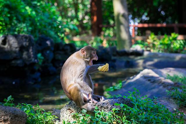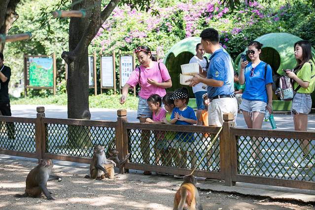 这个片区猴子很多,饲养员用大米喂它们,猴子吃的很厉害,在这里也可以购买猴食喂他们,猴子会成群结队的围着你,喂猴子的时候一定不能害怕和躲闪,会有猴子误以为你不喂它而攻击你。