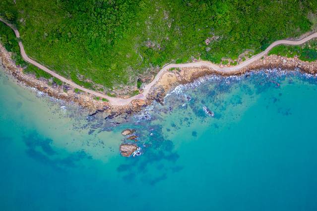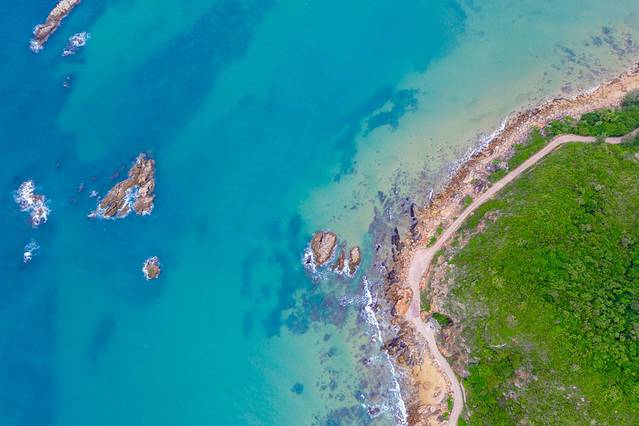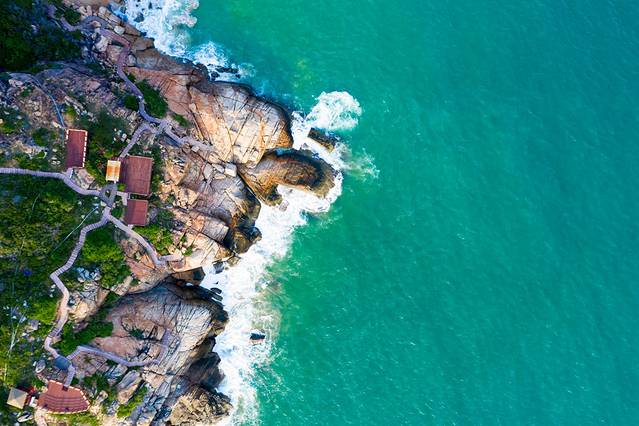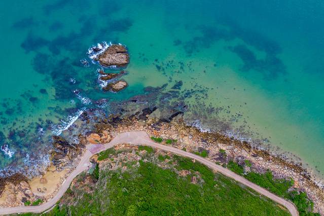 随着车辆沿着环海公路行驶15分钟的样子,便来到了呆呆岛,一旁会有工作人员介绍岛屿游览路线图,呆呆岛很小很小,右侧为情人崖,左侧为沙滩区域,建议先去右侧情人崖一览呆呆岛海岸风光,再去海滩戏水。