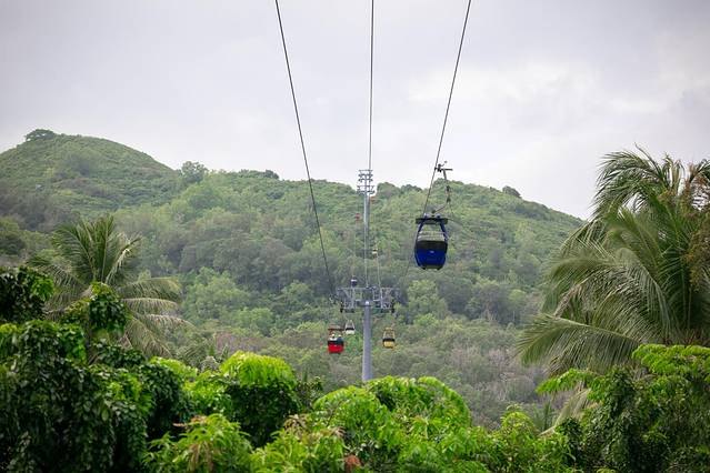 跨海索道整个乘索时间大约花费6-8分钟,只顾拍照,忘记看时间。一个车厢可坐4位游客。和其他景区不同的是,这个车厢是没有玻璃封闭的,坐在缆车上可以360度的欣赏海上美景,吹着海风,暇意极了。