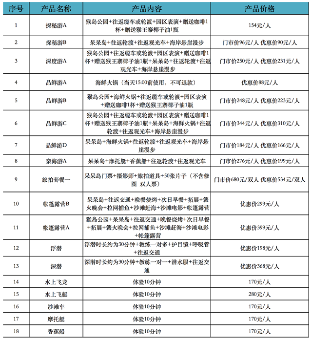 1、猴岛上面有天朗酒店可以预定,也可以住沙滩帐篷,不过沙滩帐篷为了安全不单独售卖,至少八人成团可以一起在岛上睡帐篷,但是有套餐比如篝火晚会,海鲜火锅一套的。