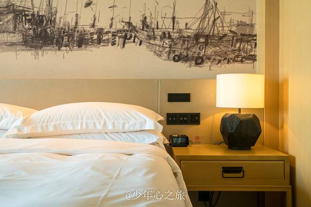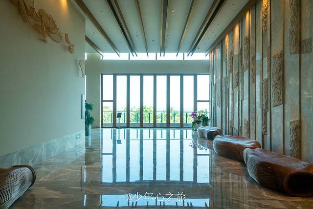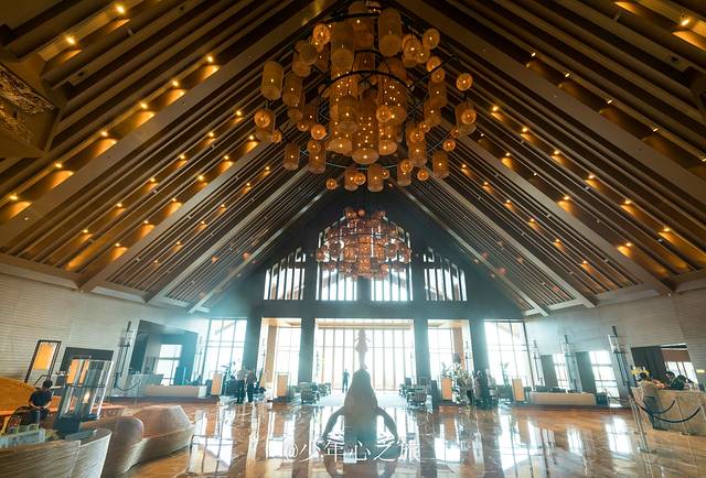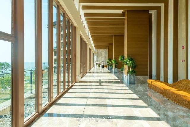 进入大堂内,暖黄的色调让人感觉别样的温馨,挑高的大堂中间没有柱子支撑,视野异常的开阔,迎面扑来的是刺眼的光,走近一看竟是沙滩和大海。大堂的桌椅也特别有意思,藤编的工艺让人无比的接近自然,原始古朴又带着艺术与时尚,才缓过神来,原来汕尾以前是一个渔村,时尚的希尔顿品牌并没有以高傲的姿态展现自己的价值理念,而是吸取了本地文化的精髓,将渔村文化和自己的品牌理念完美的结合起来,展现一个具有当地文化特色的希尔顿酒店。