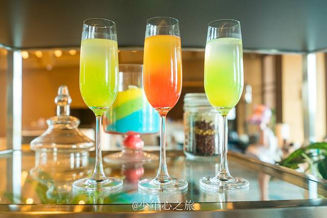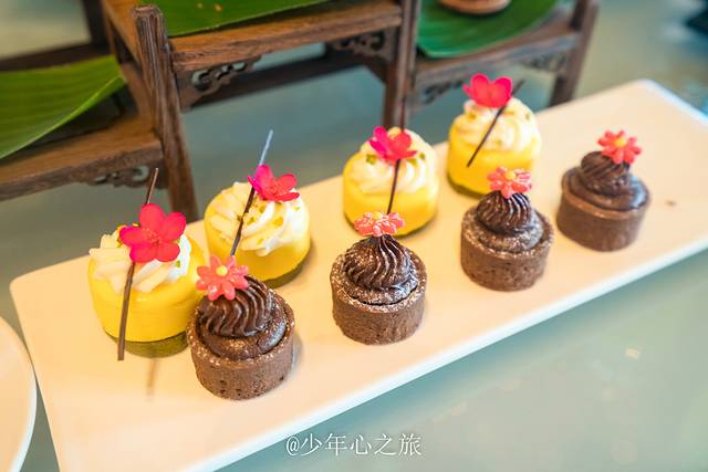 来到酒店,我们并没有急于上客房,而是选择绿洲大堂吧缓解一下我们旅途的疲惫,这种甜品点心和果汁饮料都是无限量自助的,除了精致的外观之外,我还注意到一个细节,有部分甜品不是放在盘子里边的,而是用古代文字竹简来承载,原来下午茶也可以弄得如此温文儒雅,这样的甜点吃起来也更加的美味。
