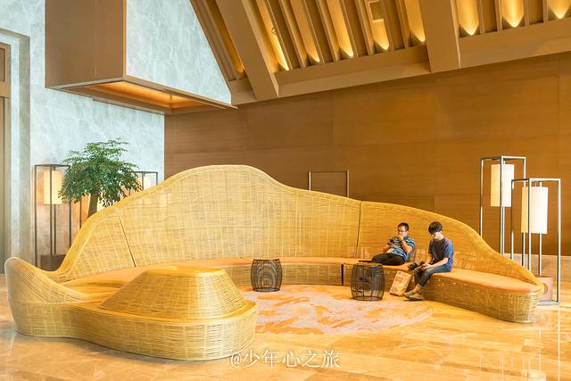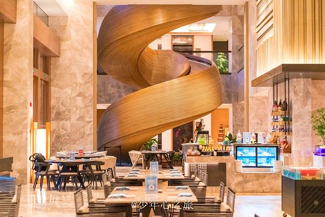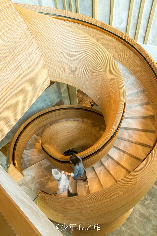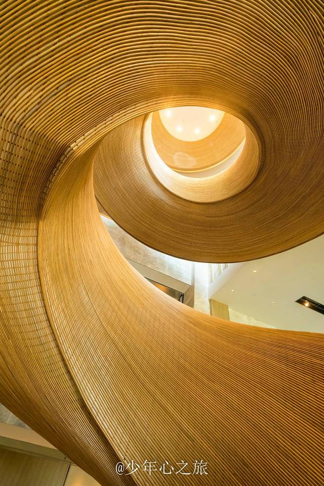 酒店的网红打卡点除了无边际泳池,还有这条极具艺术气息的旋转楼梯,从一楼连接到三楼,每个角度都可以拍出刷爆朋友圈的人像照片,除了优美的曲线之外,藤编工艺也让这条楼梯极富有质感,看起来非常的赏心悦目。