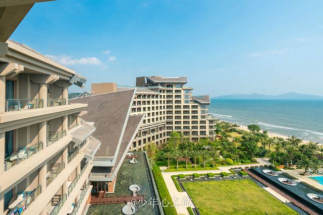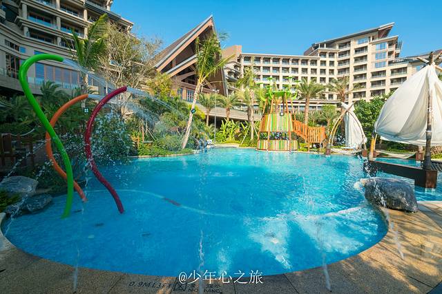 走到宽敞的阳台上,可以看到酒店的整个后花园,有嬉水乐园和无边际泳池,都被茂密的椰林所包围,入住的小姐姐已经迫不及待地在泳池摆起了姿势,与之连在一起的,还有绵延7km的海滩,很有海南三亚度假的感觉。