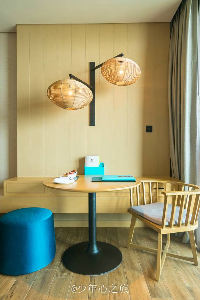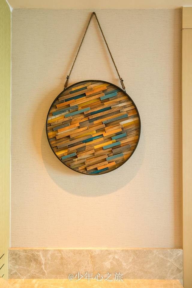悠哉地享用下午茶之后,我们提着行李直奔房间,这条承载阳光的走廊通道,走起来无比的舒适惬意,暖暖的阳光打在身上,左边就是郁郁葱葱的林木和无尽的大海,而墙上渔村元素和藤编木质的休闲座椅,也为这公共区域增色不少。