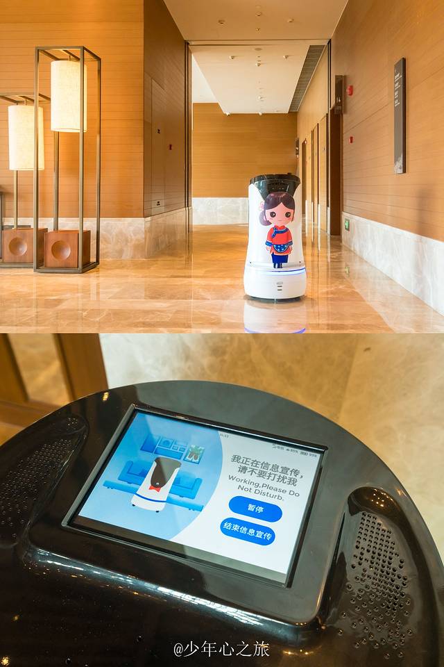 而引领我们走向客房电梯的,竟然是这一个萌萌哒的机器人,没客人的时候,他会在前台和电梯之间来回走动,遇到人的时候,还会跟你播放酒店和这座城市的大概状况,更令人欢乐的是,当你走进想跟他问好的时候,一行“我正在信息宣传,请不要打扰我”让你顿时语噻,噗嗤一笑。这个带路的机器人有两个,一男一女,他们会自己去充电,播放的声音也很逗,给人带来快乐的同时也不经让人感慨,现代科技越来越强大了。