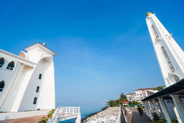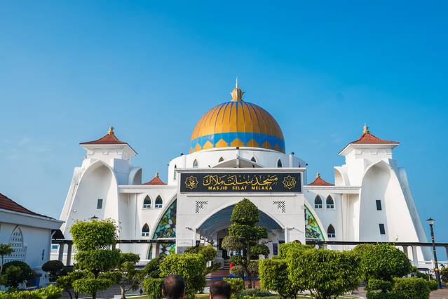 马六甲海峡清真寺,位于人工修筑的马六甲岛上。据说水位高的时候,它看起来像一个浮动的建筑。而当夕阳西下的时候,广播里传出诵经声,配合暖阳轻轻的打在马六甲海峡清真寺的金色穹顶上,折射在微波轻动的海面,那情那景,美极了;待到夜幕降临,该寺的外围会亮起彩灯,将清真寺映照成另一个颜色,乘着月色,美不胜收。