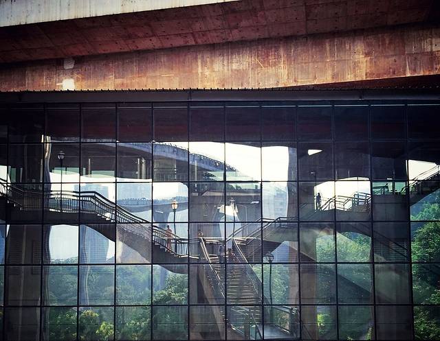 这个轻轨站建在山崖上、长江边。整个轻轨站因为地形需要被分为上中下三个部分:往上走到菜园坝长江大桥;往中走是江苑路;往下走就到了铜元局街道。正因为如此,才有了般若迷宫的人行天桥。