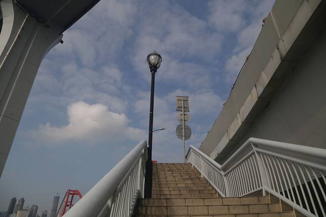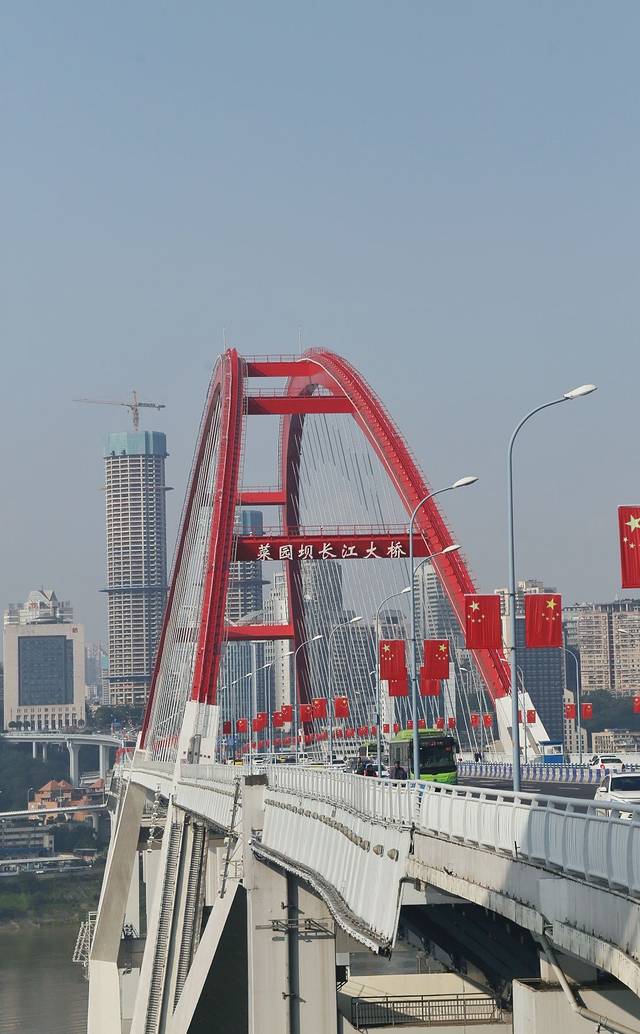 从铜元局站出口,沿着人行天桥往上便到了引桥桥面,若你从东侧而上,便能面临长江,能够清楚的看到渝中半岛方向的风景。