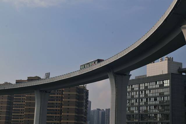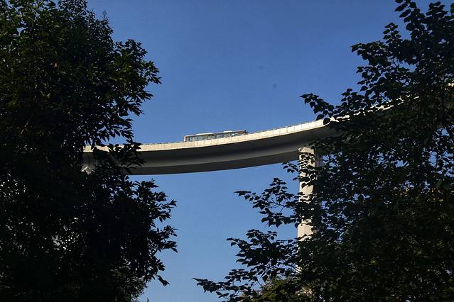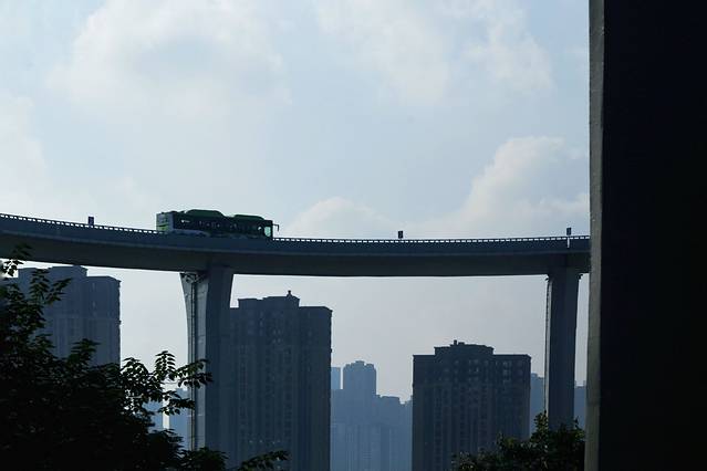 连接菜园坝大桥北桥头的就是苏家坝立交。作为全国城市最高的匝道,高度72米,意味着公路修在了24楼的高度上。同时,它还是一个360度的转桥。