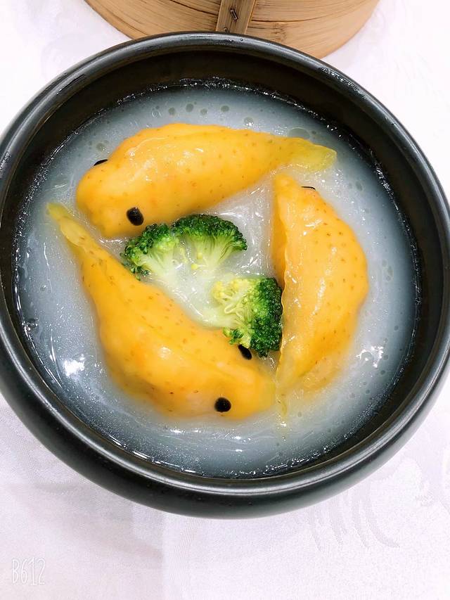 ,毕竟广州那边的点心是要尝尝的嘛,由于楼主不是太能吃甜的,所以就点了一个比较另类的点心,口味还不错。最后一道菜叫东星斑虾饺