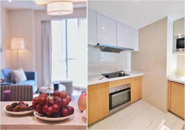 这次预订的两室一厅套房在15楼,一进门映入眼帘的是公寓准备的时令欢迎水果,午后的馨甜就这么轻易被俘获。