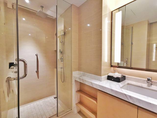 7楼的露天泳池,浴室里干蒸房湿蒸房、电子存物区、吹风机等设施一应俱全,可直接刷房卡进入。