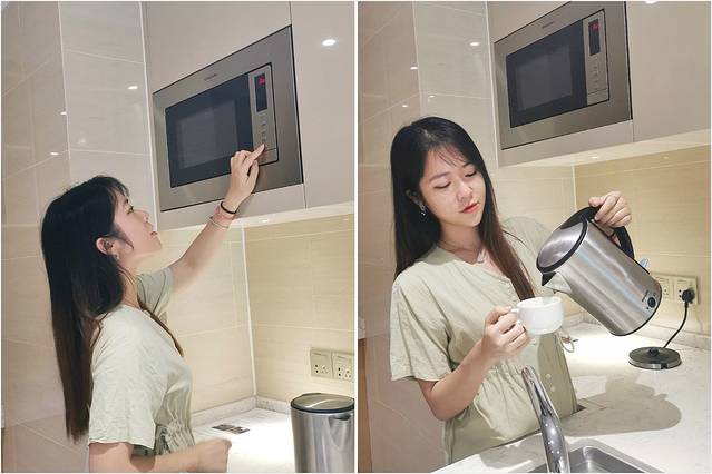 住在盛捷的一天里,最为喜欢的是公寓里的开放式厨房,厨房内天然气、油烟机、电冰箱、甚至是烤箱、微波炉、锅碗瓢盆 、冷热切换水槽都已标配码齐。住在这儿只需要买好食材在公寓便可大显身手一番,由内而外感受像在寻常家庭一般的温馨日常。