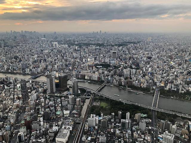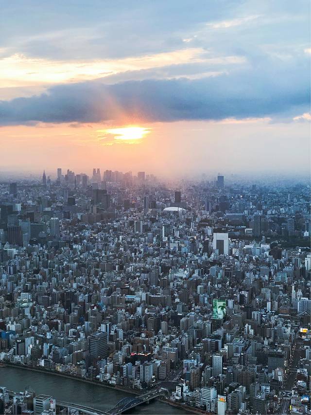 🌆晴空塔有2个观景台,首先到达的是350米高的天望甲板。在360度全玻璃的观景台上,可以俯瞰整座城市。密密麻麻的楼房,蜿蜒的河流,还能看到部分标志性地标:浅草寺、东京塔、台场等。在观景平台上,还有一些装饰性的拍照留念框,和互动望远镜🔭等。眼看着太阳快要落下来了,赶紧坐电梯上更高一层,在最高处看城市日落🌆。