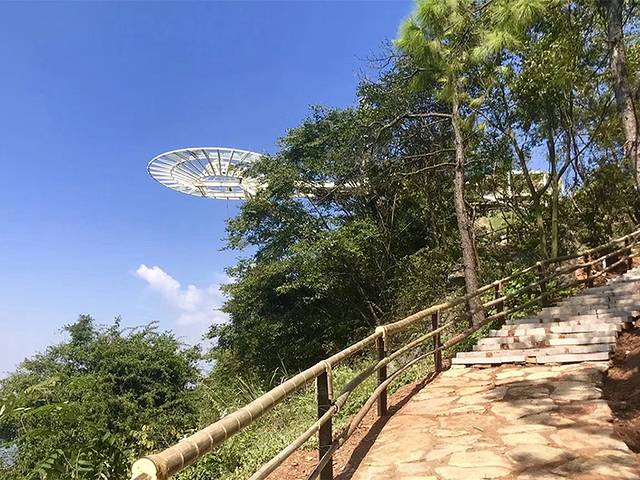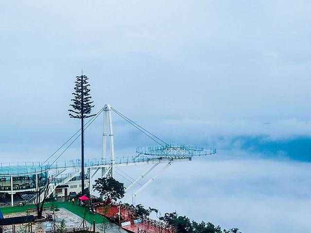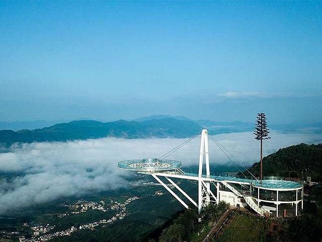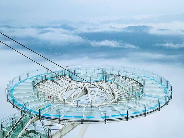 乘坐一条1500余米的缆车,到达半山腰后拾级而上。一抬眼,便会看见山巅的观景圆盘“天空之城”犹如一面巨大的镜子,悬挑到半空中