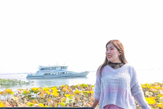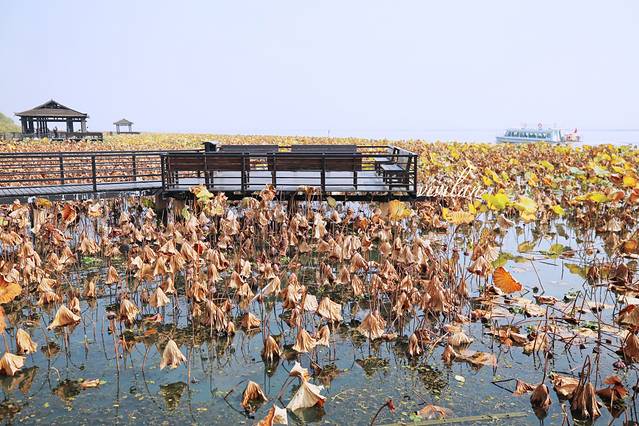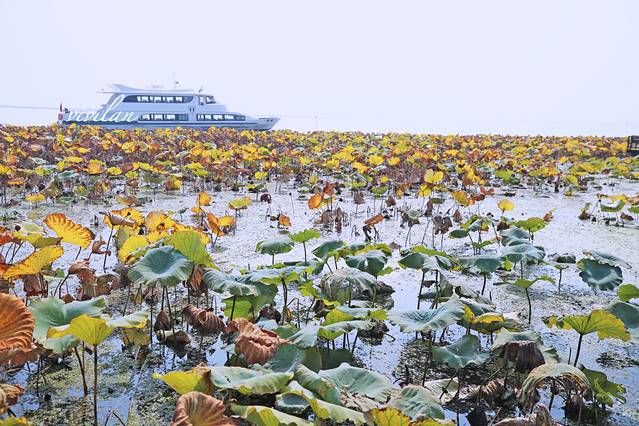 早餐后,大家从酒店出发相约前往一派湿地风光的莲花岛,经历了大巴,游船,大约两个小时后得以登岛,作为新开放的景区,这里的人并不多,却呈现出恬静安宁的气质,残荷,船只,亭子,迷人的秋日诗意画卷,出现在你的面前。