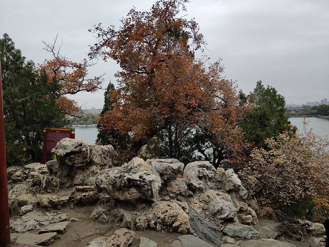 北海公园唯一一处最佳拍照机位,在白塔下平台栏杆外面一处假山石前,人物坐在石头上,远景可以看到湖水,右边构图可以加廊檐柱。