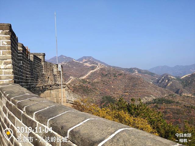 19年11月初,秋高气爽,天空湛蓝,游人如织。风景照只能拍向无人的区域。明长城当年建造工程不易。但是长城灰砖上刻字破坏美观太多了。中国人至今都一直缺乏普及的审美素质教育,古代工艺美术水平极高古陶瓷最为代表,现在审美差是毁灭美好的人事物太多了,根本原因是民间财富太少,吃饭仍是主要问题。