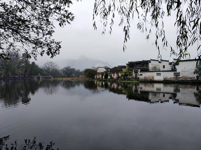 一早8点多,大家就来到了宏村景区,此时景区已经有了很多游客,网上购买门票进入景区(网上购买94/张,现场买104/张)。几百年历史宏村居民汪姓占到70%,进入景区后首先映入游人眼帘的是村前南湖,隔湖相望是一片白墙灰瓦的徽派古民居,民居的白色墙壁上呈现大片灰黑色霉斑,好像在向人们展示这些建筑物的悠久年代与历史沧桑。一座半圆形拱桥连通了两岸的石板路,湖水中古村落的倒影清晰可见,衬映着远处的群山,将这湖水、古民居、群山、水中的倒影融汇到一起,宛如欣赏到了一幅优美的水墨画卷,一幕幕的呈现在游人的眼前,游人无不被这迷人美景,巧夺天工的布局设计,徽派建筑中的传统与文化内涵所折服,从心底里发出无声的赞叹!村中许多明清时期的民宅、学堂、戏台、祠堂等古建筑保存完好,设计建造精美,犹如一座座历史久远的古董艺术品,在向人们展示述说着它们背后的故事与传说。参观游览的人流中,有许多前来写生、摄影创作的美院学生或摄影爱好者,这里早已被国内各大艺术院校确定为美术、摄影实习基地。