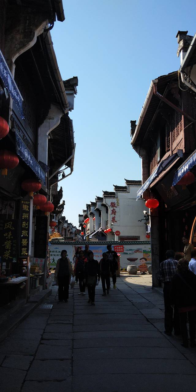 又沿江来到了市区的屯溪老街,老街是在原有古街旧址修复而建的,现已成购物游览步行街,临街建筑物充满了浓郁的徽州当地特色,商品琳琅满目,游人熙熙攘攘,从笔墨纸砚文房四宝,奇石、“古董”、字画、篆刻等玩物,到茶叶、臭鳜鱼、黄山烧饼、毛豆腐等特色食品、纪念品,徽州本地特产应有尽有,但商品大都是卖给外地游客的,本地人很少到这里买东西。