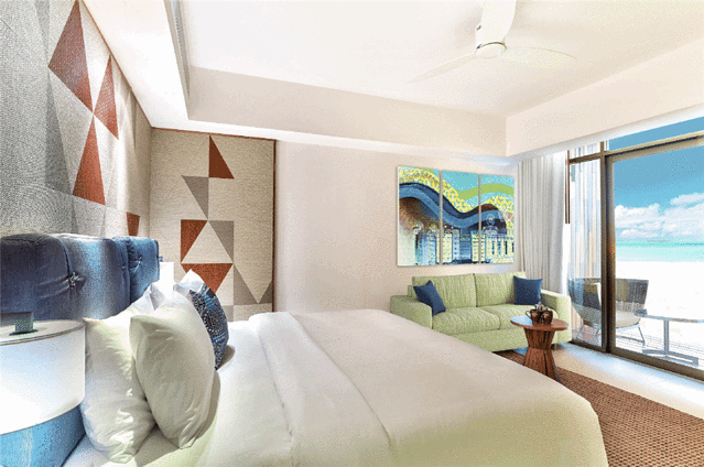 屋内地板、摆设以及装修都有马代的元素~风格偏现代化,和hard rock主题比较贴合~☺️出门即可通往细软的沙滩,步行就能到达海域
