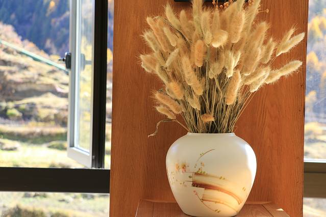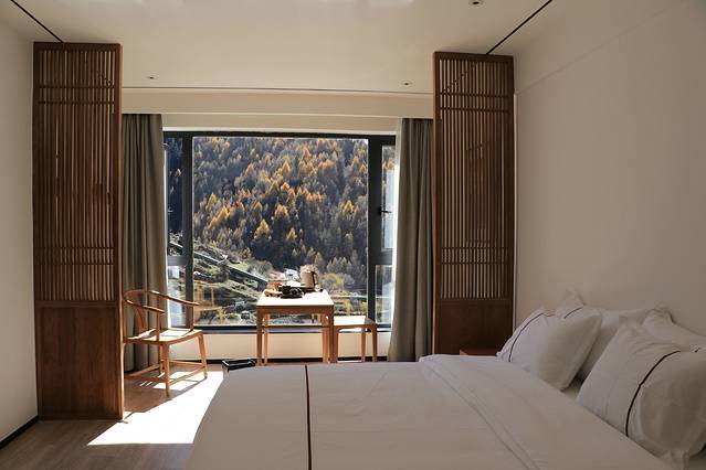 酒店给我们安排的是林海山韵双床房,10月的四姑娘山正值彩林期,从窗外可以看到雪山和金黄、橙红的彩林。房间很干净,最重要的是有地暖,简直不要太开心,所以并没有很深刻感受到昼夜温差大,基本穿一件稍微厚的衣服下楼吃个饭就直接回房了,客房内还摆放有茶具和茶叶、咖啡等。