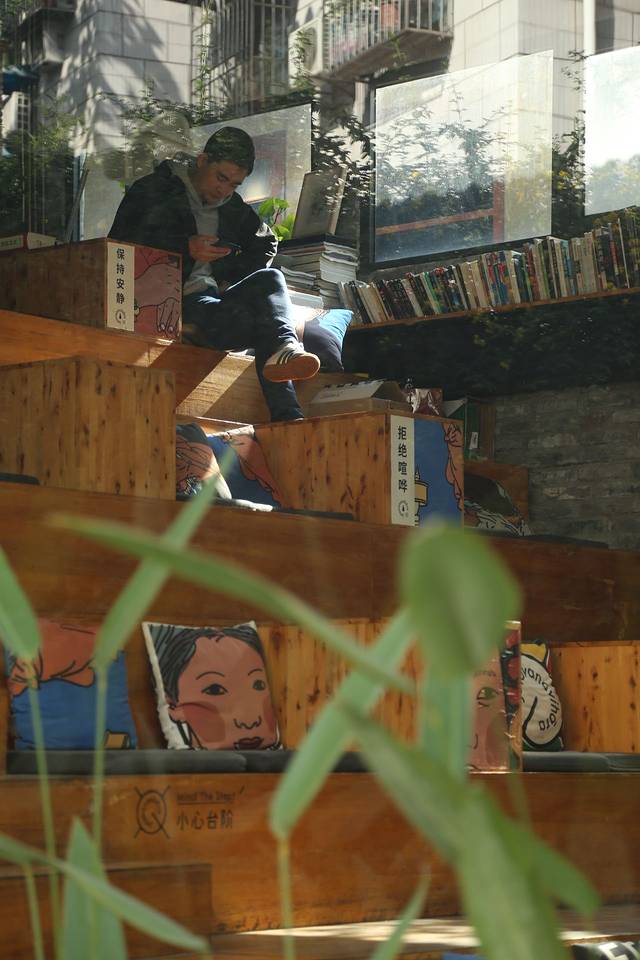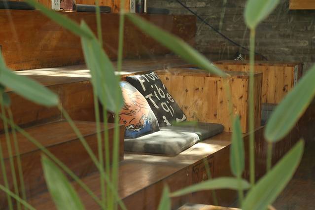 路过的时候便不自觉的被这家小店的样子所吸引。透明的玻璃墙,里面是长长的木质看台台阶,坐垫抱枕就随意铺在上面,光透过玻璃洒落在布上。