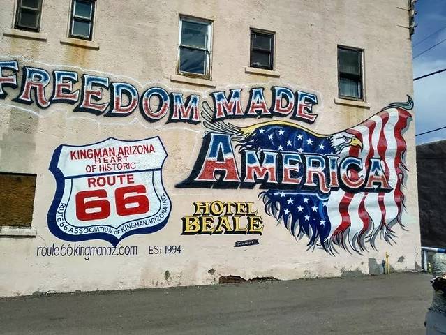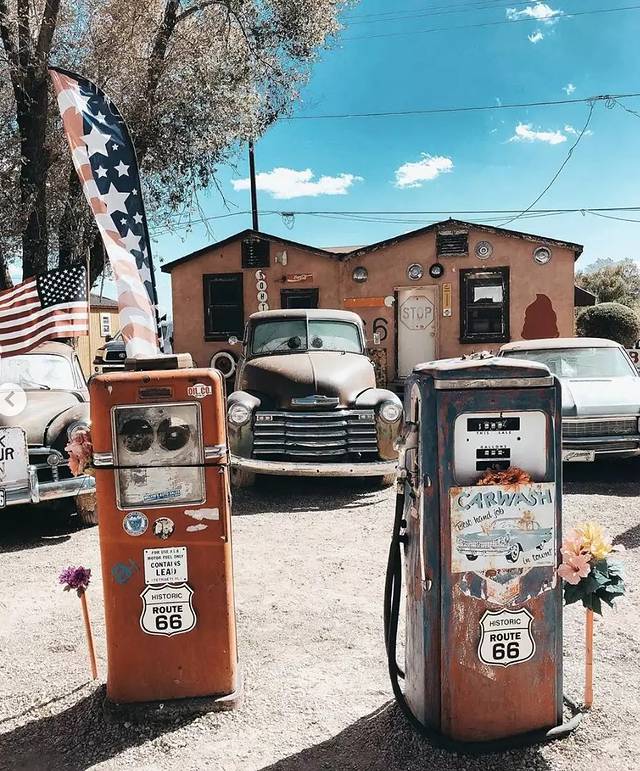 上世纪中叶的建筑、老旧的汽车、霓虹灯,散乱堆放在公路两旁,商店里到处都是带有66号公路的标志,公路旁有很多画满涂鸦的房子、印第安风情的商店、已经不再使用的加油站、电影主题或复古风格的汽车旅馆等等,还有一座收藏了大量古董车的汽车博物馆。