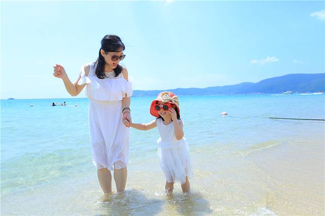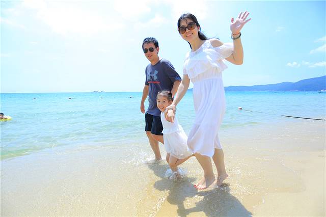 我们就来到天域沙滩,这家主打亲子牌的酒店,国庆价格飚三倍,简直令人发指。但是确实人性化,直接从大堂穿过,长驱直入,向海边走,就到沙滩了。私家沙滩人果然很少,这边有很多旅拍摄影师,记得谈好价格,张口是一张20,一般可以谈到一张10元。打包了14张120元,开心地拍了一组全家福。