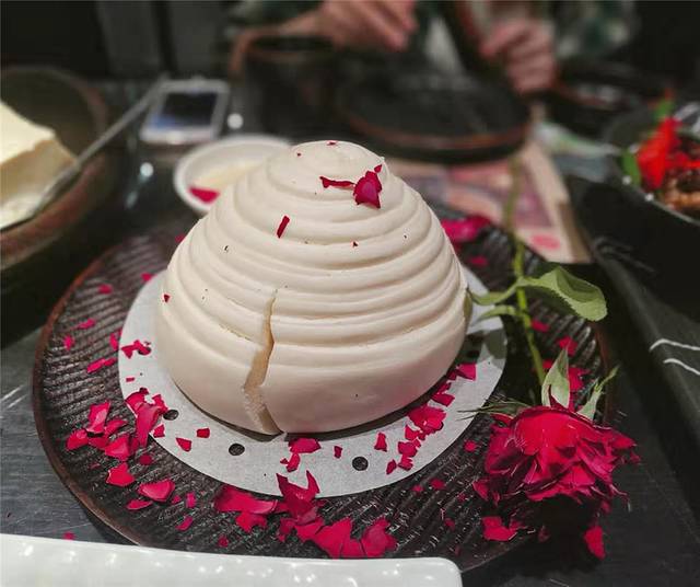 【有机奶香大花卷】,第一次发现吃花卷也这么有仪式感!先用干燥过的玫瑰沾点干冰,然后在花卷上绕几圈。花瓣散落在花卷上,特别美! 花卷沾上炼乳,甜甜的,宝宝超级喜欢。