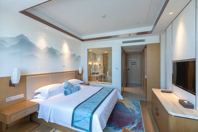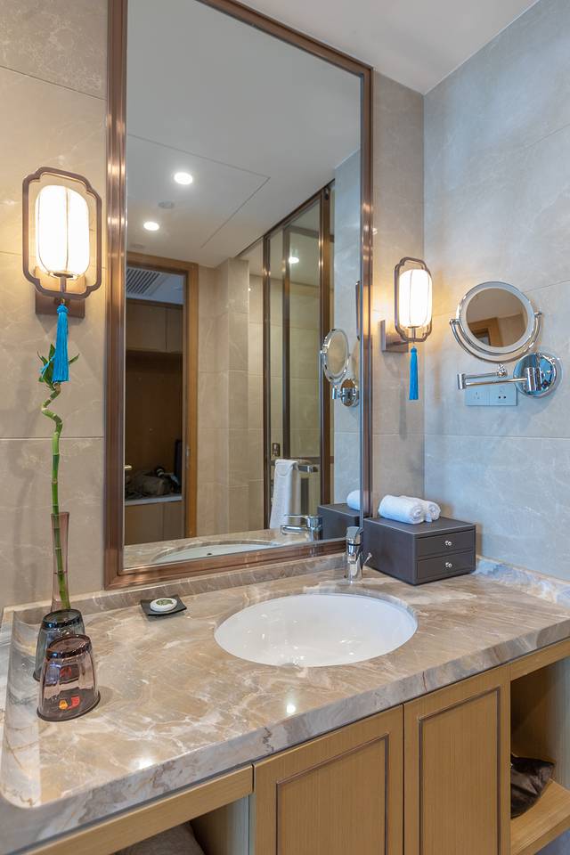 大床洁白如净,复古蓝色抱枕与背景墙相呼应,看似不经意,实则将酒店的温度诠释无疑。房间内设施一应俱全,卫生间内的设计深得我心,鹅黄色的大理石瓷砖,复古文艺的墙灯,艺术感十足的挂画,还有那令人眼前一亮的绿植,每一处陈列都恰到好处,让人倍感酒店的温情。
